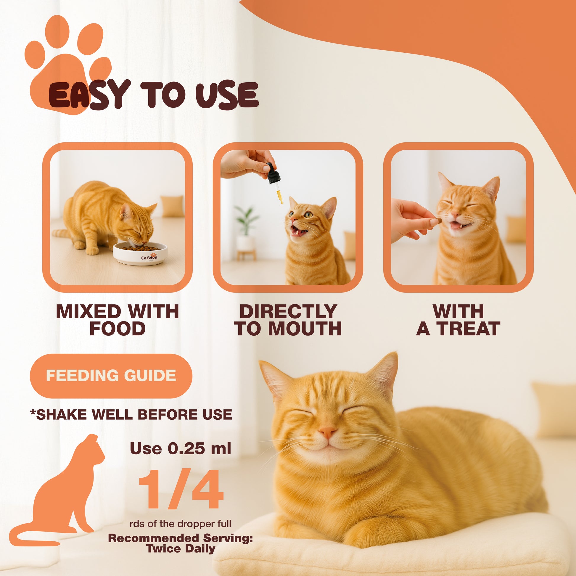 Simply use the dropper to give it directly into your cat’s mouth, mix it with their food, or add it to a favourite treat. Its liquid formula makes it easy to absorb without fuss.