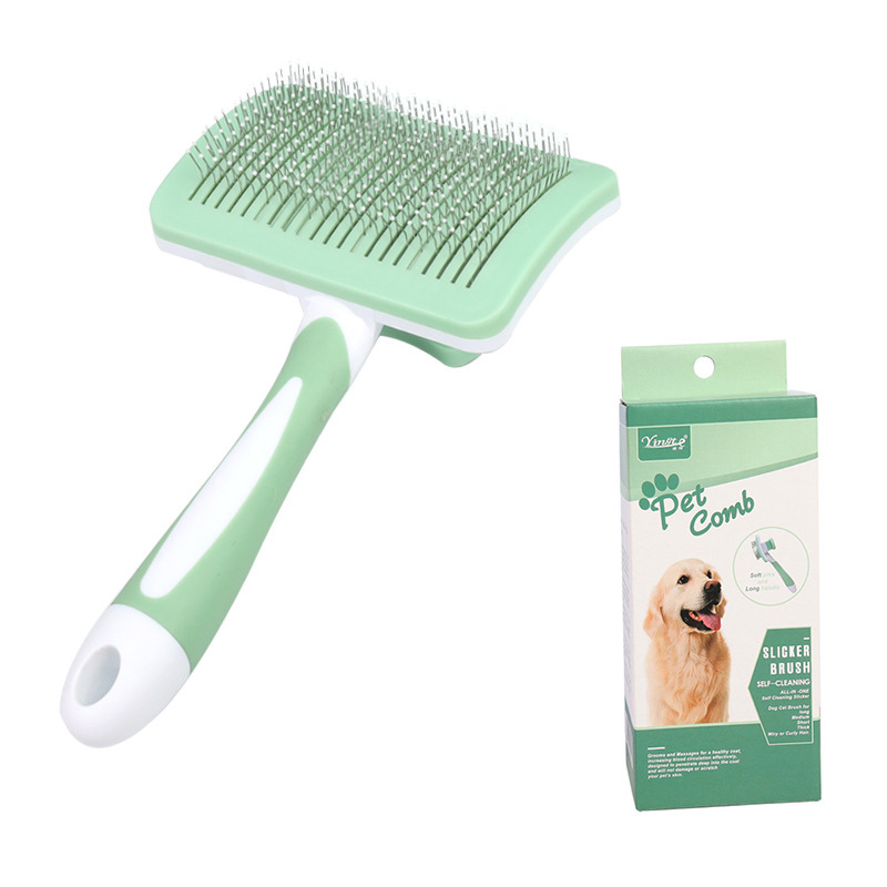 This self-cleaning slicker brush simplifies dog grooming, featuring soft, flexible pins that gently untangle knots and remove loose hair for a smooth, shiny coat.